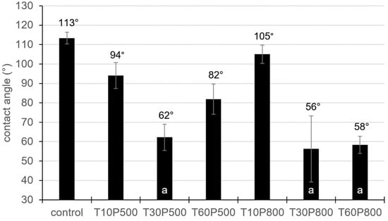 The contradictory results of the LPMD treatment of sunflower seeds are presented in Figure 7. However, it is possible to find some similar trends for both microwave powers. The apparent contact angle of the treated variants was higher than that of the untreated one for treatment durations of up to 30 s and lower for the 60 s treatment. The most prolonged treatment significantly reduced the contact angle compared to a shorter duration. However, concerning the untreated sample, there was a statistically significant difference only at 500 W (p = 0.000), while it was nonsignificant for the power of 800 W (p = 0.246). The best effect (decrease to approximately 56°) was observed for the T60P500 variant, and its contact angle achieved 78% of the untreated variant value.