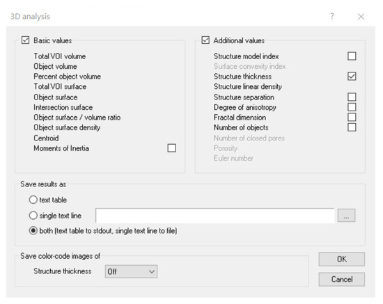 | Description | Tissue Volume (TV) | Object Volume (Obj.V) | Percent Object Volume (Obj.V/TV) | Structure Thickness Distribution (St.Th) |
