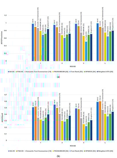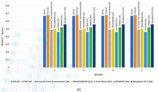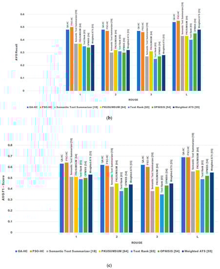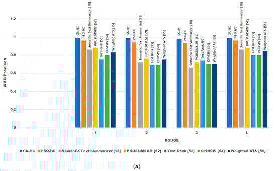 Figure 5a–c represents the average precision, average recall, and F1 score, respectively, for DUC dataset. These figures represent the simulations results of proposed algorithms GA-HC and PSO-HC with other understudied models. For evaluation purposes, the proposed algorithms GA-HC and PSO-HC are also compared for CNN/Daily mail dataset in Figure 6a–c for average precision, average recall, and F1 score, respectively. The results are compared with understudied algorithms. In all results, proposed algorithms performed efficiently in comparison with other algorithms due to exploration and exploitation capabilities of GA-HC and PSO-HC. Due to exploration capability proposed algorithms easily escape from local optimum values, and due to exploitation capability, achieves better optimum values. The GA-HC performed better than PSO-HC due to more exploration capability than PSO-HC.