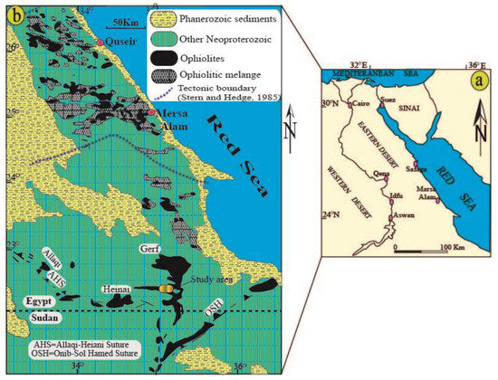 - El Bahariya, G.A. The Ophiolite-Dominated Suprastructure, Eastern Desert, Egypt. In The Geology of the Egyptian Nubian Shield. Regional Geology Reviews; Hamimi, Z., Arai, S., Fowler, A.R., El-Bialy, M.Z., Eds.; Springer: Cham, Switzerland, 2021. [Google Scholar] [CrossRef]