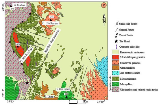 Neoproterozoic ultramafic rocks are commonly distributed in central and southern sectors of the Egyptian Eastern Desert (ED) in the northern Nubian Shield. The Nubian Shield is considered the western side of the Arabian Shield, both of which are juvenile crusts forming the Arabian–Nubian Shield (ANS) of the northern East African Orogeny (EAO) [1]. These rocks constitute 5.3% of Egypt’s crystalline outcrops, mostly as allochthonous nappes [2,3,4,5,6]. The field and geochemical signatures of the ultramafic magma provide clues as to the different tectonic settings. They are either older, dismembered ophiolitic fragments—which are partially or completely metamorphosed to serpentinite, mostly consisting of chromitites and magnesites of mid-ocean ridges or supra-subduction settings—or younger, unmetamorphosed ones [7,8]. The latter, with an age > 640 Ma [9], encompass fresh, concentrically arc-zoned dunites and clinopyroxenites of Alaskan type, mostly consisting of PGEs, Ni–Cu sulfide deposits, and fresh layered intrusions hosting Fe–Ti oxides [10,11].