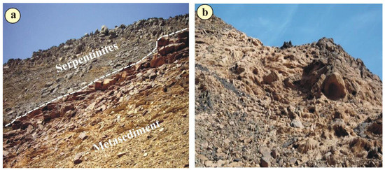 The examined ophiolitic ultramafic rocks are represented by the dominant serpentinite and less serpentinized peridotites, which are usually metamorphosed to greenschist facies. Field observations reveal that the examined ultramafic rocks cover ~100 km2, forming an extended N–S ridge with a high relief (950–1100 m above sea level) at the north–south side of G. Abu Hadeida. They are exposed as mountainous blocks, which are mainly massive and grey–black in color. Furthermore, they exhibit a closely spaced system of joints trending NE–SW and NW–SE along the fault plane. They are thrust over the metasediments (Figure 2a), as indicated by dip directions, with some shearing and tightness of foliation close to the contact. These metasediments are fine-grained, highly foliated, laminated, and exhibit alternating mafic-rich and -poor layers of schists (Figure 2b). Ultramafics are partially to extensively sheared and highly altered to foliated (asbestiform), buff colored, talc–carbonate, carbonate-rich (listwaenite), and magnesite rocks—especially along fault planes and shear zones. These alteration products (listwaenite) occur either as patches or as dike-like with high relief relative to the host (serpentinite)—especially along fault planes.