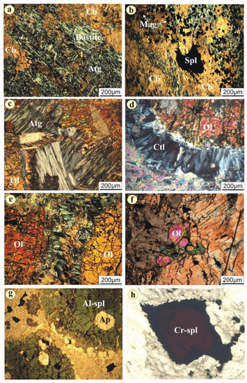 Photomicrographs of serpentinites—(a) sherds of antigorite (Atg) forming a bastite texture after pyroxene; (b) patches of carbonates (Cb) associated with disseminated magnetite (Mag)—and serpentinized peridotites: (c) fibro-lamellar antigorite enclosed between olivine (Ol) crystals; (d) perfect veinlet of chrysotile (Ctl); (e) replacement of olivine by antigorite; (f) schiller structure of orthopyroxene (Opx); (g) two porphyroblasts of green spinel (Al-Spl) engulfing apatite (Ap); and (h) fresh core of Cr-spinel (Cr-Spl) rimmed by secondary Cr-magnetite (Cr-Mag).
