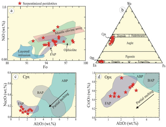 (a) Fo vs. NiO binary variation of olivines. Fields of olivine mantle array [27], ophiolite [22], forearc peridotite (FAP) [24], and layered intrusions [7]. (b) Enstatite (En)–ferrosilite (Fs)–wollastonite (Wo) nomenclature diagram of pyroxene minerals [23]. (c) Na2O vs. Al2O3 and (d) Cr2O3 vs. Al2O3 binary diagrams [24]. Field of forearc peridotite (FAP) and abyssal basin peridotite (ABP) obtained from [24], and back-arc peridotite (BAP) [28].