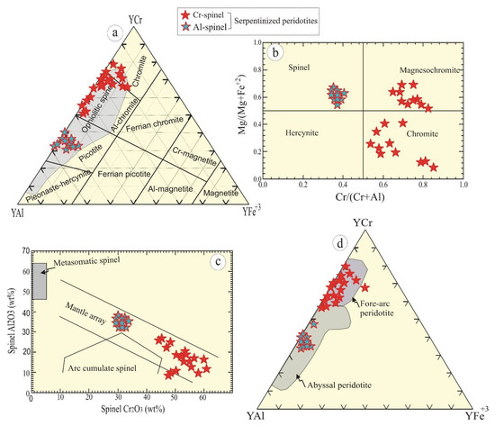 Spinel is predominantly composed of opaque minerals, and reveals heterogenetic composition; it can be distinguished into Cr-spinel (Supplementary Materials, Table S3) and Al-spinel (Supplementary Materials, Table S4). Al-spinel is found in the picotitic field, whilst Cr-spinel straddles the chromite field, and both are related to ophiolitic spinels [29,30] (Figure 5a). Furthermore, Cr-spinel can be classified into chromite and magnesochromite, whereas Al-spinel is classified as spinel according to the Cr# versus Mg# binary discrimination diagram [31] (Figure 5b). Al-spinels contain high contents of Al2O3 (33.55–38.55, av. 35.77 wt.%), MgO (12.37–16.12 av. 14.84 wt.%), and Mg# (Mg/Mg+Fe2+) (0.55–0.69, av. 0.64 wt.%), and low contents of FeO (11.98–20.16, av. 16.66 wt.%), Cr2O3 (28.48–34.17, av. 31.46 wt.%), and Cr# (Cr/(Cr+Al) (0.34–0.39; av. 0.37), compared to those of Cr-spinel. In addition, they are found in the mantle array field, suggesting their magmatic nature (Figure 5c). The Cr# contents of Cr-spinel are similar to those of the Egyptian Eastern Desert [32]. Cr-spinels contain YCr (Cr/(Cr+Al+Fe+3), YAl (Al/(Al+Cr+Fe+3) and YFe+3 (Fe+3/(Fe+3+Al+Cr), similar to forearc peridotites [32], whilst the contents of Al-spinel are similar to those of abyssal peridotites, which may be formed during inanition of subduction processes in proto-forearc environments (Figure 5d).