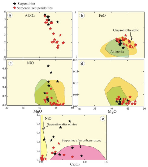 Serpentine binary variations: (a) MgO vs. Al2O3; (b) MgO vs. FeO; (c) MgO vs. NiO; (d) MgO vs. MnO; and (e) Cr2O3 vs. NiO. Fields of antigorite and chrysotile are from [38]; serpentine after olivine and orthopyroxene fields are from [39].