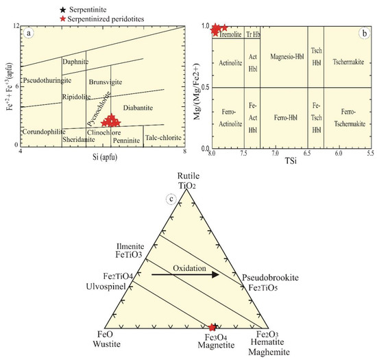Likewise, chlorite and tremolite represent the main alteration products of pyroxene. The examined tremolites (serpentinized peridotites) have SiO2 ranges from 48.34 to 59.81 wt.%, MgO from 23.33 to 24.71 wt.%, and CaO from 13.17 to 14.63 wt.% (Supplementary Materials, Table S7). They are classified as tremolite according to [40] (Figure 7b). They have Ti contents ranging from 0.003 to 0.014 apfu, with a mean value of 0.0036 apfu, reflecting their metamorphic nature. Furthermore, greenschist facies of the examined rocks are indicated by low Na and K contents of tremolite (av. 0.003 apfu) [41].