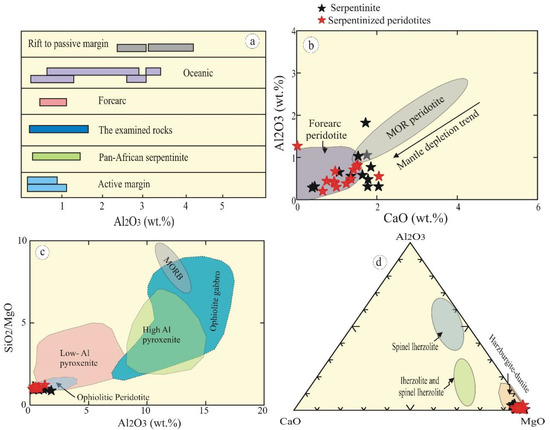 (a) Al2O3 of the examined rocks compared to Pan-African serpentinites [22] and others from [48]; (b) CaO vs. Al2O3 of bulk rock [49]; (c) Al2O3 vs. SiO2/MgO diagram [45]; and (d) CaO-Al2O3-MgO ternary diagram [50].