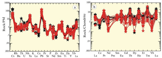 (a) Trace elements of the examined ultramafics normalized to the primitive mantle; and (b) chondrite-normalized rare earth elements [51].