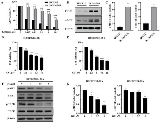 Exposure to glycyrol (GC) leads to reduced viability of HCC827 GR cells in vitro. (A) Comparison of the sensitivity of HCC827 and HCC827GR cells to gefitinib. (B,C) Comparison of MET activation between HCC827 and HCC827GR cells (two replicates). (D,E) Effect of GC on cell viability of HCC827GR cells. (F,G) Influence of GC on MET activation in HCC827GR cells. * p < 0.05, ** p < 0.01, *** p < 0.001, **** p < 0.0001.