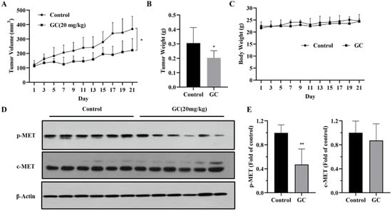 Having found the inhibitory effect of glycyrol on HCC827GR cell viability and MET activation, we then questioned whether these suppressive effects could be achieved in vivo. Subcutaneous inoculation of HCC827GR cells into the right flank of male NOD-Prkdcscid Il2rgnull (NPSG) mice established the HCC827GR xenograft model. As shown in Figure 2A–C, treatment with glycyrol at a dose of 20 mg/kg significantly suppressed HCC827GR-mediated tumor growth and reduced the final tumor weight without affecting the bodyweight. In line with the in vitro finding, a significantly reduced MET phosphorylation was observed in glycyrol-treated HCC827GR tumor samples (Figure 2D,E).