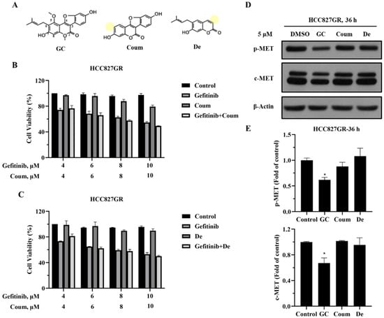 To decipher the structure-activity relationship of glycyrol in terms of its sensitization effect, we assessed the combination effect of gefitinib and two analogues of glycyrol, demethylsuberosin (De) and coumestrol (Coum). The chemical structures of glycyrol, demethylsuberosin and coumestrol are shown in Figure 4A. These three compounds belong to the coumarin family, which is structurally constructed by a benzene ring fused to α-pyrone ring. In comparison with glycyrol, the benzofuranyl group at c-3/4 is absent in demethylsuberosin, while the isopentenyl group at c-6 is absent in coumestrol. HCC827GR cells were treated with gefitinib alone or in combination with demethylsuberosin or coumestrol at the same concentrations used with glycyrol for 48 h, and the changes of cell viability are shown in Figure 4B,C. The synergistically inhibitory effect of the combination of gefitinib and glycyrol was not observed by combining gefitinib with either demethylsuberosin or coumestrol. These results were consistent with the inability of these two analogues to inactivate MET (Figure 4D,E). The data indicate that the benzofuranyl group at c-3/4 and the isopentenyl group at c-6 are essential structures for the sensitization effect of glycyrol against HCC827GR cells.