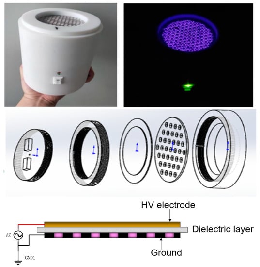 In this study, we used a portable surface discharge device to generate plasma. The device is driven by a 12 V DC battery with an inverter to AC 220 V voltage. It is connected to a high-voltage module for boosting, has a high-voltage electrode (stainless steel) and ground electrode (stainless steel), and uses a PTFE dielectric plate to achieve battery-driven plasma along the surface discharge. Figure 1 shows the physical and structural drawings of the device.