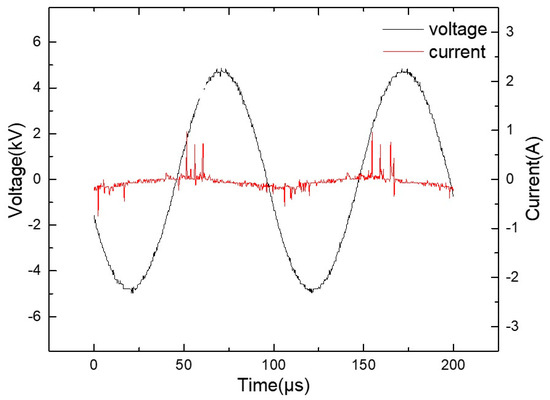 The discharge voltage of the device is 6 kV and the frequency is 15 kHz. It has an oscilloscope (DPO3052; Tektronix, Beaverton, OR, USA), voltage probe (P6015A; Tektronix), and current probe (P6139A; Tektronix). Figure 2 shows the current and voltage waveform of the device. Emission spectra (OES, ANDOR, Belfast, UK) were captured by an ANDOR SR-750I grating monochromator (grating slot 1200 lines · MM−1). The concentration of the active particles in the liquid phase was measured using a chemical fluorescence probe kit (Biyuntian company, Shanghai, China) and a 96-well plate.