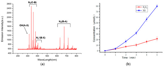 (a) Spectrogram of portable surface discharge; (b) Detection of liquid phase active particles in portable plasma activated water.