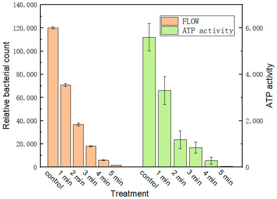 Under aerobic conditions, luciferase can catalyze the oxidation reaction between luciferin and adenosine triphosphate (ATP) to form oxyluciferin and emit fluorescence. The Biolum handheld ATP fluorescence detector was developed based on the above principle. By detecting the intensity of the fluorescence signal, the content of bacteria in the target to be tested can be determined. By comparing with the control group, the sterilization efficiency of the device can be obtained. Before the experiment, the Quickswab was removed from the refrigerator and left for 20 min to return to room temperature. Samples were taken from the control group and the treatment group, and the reagent was injected into the reaction tube and had full contact with the swab. After the complete reaction, the swab was put into the ATP detector to detect the ATP content of bacteria [31,32].
