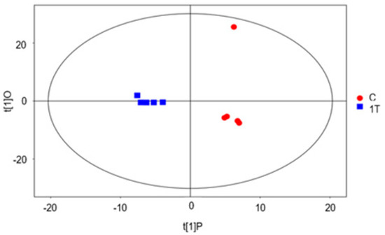 Dispersion points diagram of the OPLS−DA model of group 1T versus Group C.