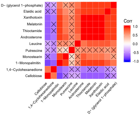For each group comparison, we calculated the correlation coefficient of the quantitative value of the differential metabolites using Pearson’s method, which was presented in the form of a thermal map (Figure 7). In the figure, the color blocks at different positions represent the correlation coefficient between the metabolites at corresponding positions. Red represents a positive correlation, while blue represents a negative correlation. Non-significant correlations were marked with crosses.