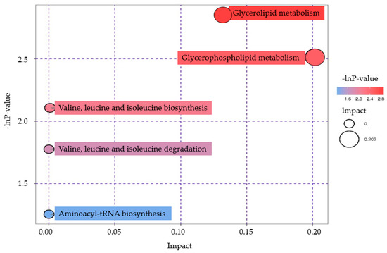 These metabolic pathways were then analyzed, and metabolic pathways related to the above differential metabolites were screened out. For specific analysis results, see the Pathway Analysis file in the Supplementary File S2. The results of metabolic pathway analysis are presented in a bubble map in Figure 8. Each bubble in the bubble diagram represents a metabolic pathway, and the abscissa and bubble size represent the impact factor size of this pathway in the topology analysis. The larger the bubble size is, the larger the impact factor is. The vertical coordinate and bubble color represent the p-value of the enrichment analysis (negative natural logarithm, namely -ln p-value). The darker the color is, the smaller the p-value is and the more significant the enrichment degree is.