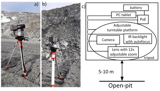 Figure 2a–c shows the photo of the designed experimental computer vision system (a), the system photo on the background of the open pit (b) and the system scheme (c). The system in Figure 2 consists of the following components:
