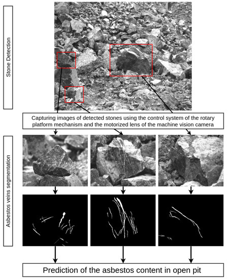 The selected camera and lens allow obtaining a resolution of about 4 pixels in 1 mm at a distance of 5 m that is assumed to be enough in comparison with the typical asbestos vein width (about 4–12 mm). Moreover, the resolution is assumed to be enough for such neural networks as the U-Net-based ones. Additionally, both the camera and lens are selected to have enhanced sensitivity in the near-infrared range. It is known that the maximum radiation of asbestos is in the near-infrared range [6,22]. The supplied battery provides 4 h of work. The control of the platform and lens is carried out automatically using the designed algorithm and its scheme described below. The full measurement time taken by the system for one open pit with 50 processed rock chunks takes about 10 minutes. The measurement time is comparable with the work of a specialist.