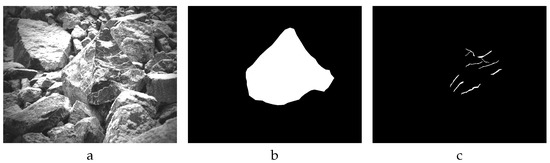 The dataset №3 consists of 69 images that were taken for 6 open pits with manual aiming in sunny weather in autumn. The image size is 2592 × 2048. Each image contains one rock chunk selected by a geological specialist as typical corresponding to open pits. Typical images and their labelled mask of rock and veins are shown in Figure 6a–c, correspondingly.