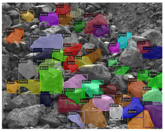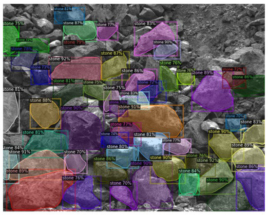 The typical result of the rock chunks in the open pit detection with obtained masks is shown in Figure 9. The obtained instance masks correspond to the ground truth one that is shown in Figure 8. There is an interesting detail that in the obtained mask there are more detected chunks than in the ground truth mask. This is due to the similarity between the rock chunks form (and features) in different images which allows the network to select such regular instances everywhere. This phenomenon also could be considered as an indicator of well-training (the lack of overfitting).