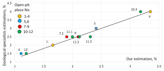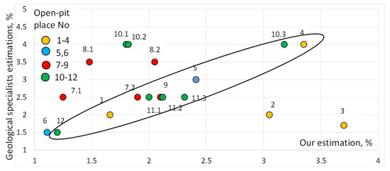 Most results in Table 5 and Figure 13 (11 from 18 open pit parts) can be considered as normal ones (parts of the places № 1, 3–6, 7.1, 9, 10.1, 11, 12—inside the ellipse in the Figure 13). However, the open pits 7.2, 8, 10.2, 10.3 (parts 2 and 3 of place №10) have a large deviation from the line that can be explained by the small amount of data (1 image with a rock chunk). The open pits 2 and 3 have a large deviation from the line due to the specificity of manual stone selection in those experiments (only asbestos-rich images). The results of the graduation without anomalies are shown in Figure 14.