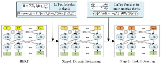 The domain pretraining stage makes the pretrained model adapt more to the domain data, such as in BioBERT [9], a linguistic representation model for biomedicine. The task pretraining stage pretrains on the task dataset, a narrowly-defined subset of the domain itself or data relevant to the task, which may be helpful for a specific task pretrained model. Figure 1 shows the detail of the TP-BERT model of LaTeX formulas. BERT is trained with a masked language modeling objective to obtain TP-BERT based on domain data (LaTeX formulas in thesis) and task data (LaTeX formulas in mathematics thesis).