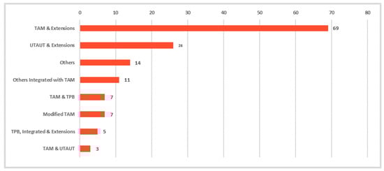 As mentioned earlier, many technology acceptance models have been discussed in different domains, including healthcare [57]. In Table A2, the authors have classified the studies based on the studied acceptance model. As seen in Figure 2, the TAM, its extensions, and modifications are leading the research of technology acceptance in healthcare (N = 76) [58,59,60,61]. It was also found that several studies (N = 21) have discussed the integration between TAM and other technology acceptance models (e.g., UTAUT, TPB) [62,63,64]. The analysis also shows that the UTAUT and its extensions were widely employed to explore the user’s acceptance of technology in healthcare (N = 26) [65,66]. Further, the results showed that the number of studies related to the employment of the TPB model is reasonable (N = 12).