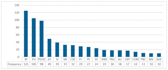 For being the key constructs of the TAM, perceived ease of use (N = 98) and perceived usefulness (N = 105) have been explored and utilized in many studies to assess the acceptance of various technologies in healthcare [60,67,68,69]. With evidence from 125 different studies, the analysis indicated that behavioral intention to use technology is the most used factor in evaluating the acceptance of different technologies in healthcare (see Figure 3). Although such a result is expected, it is significant to confirm the need for behavioral intention within the theory and practice of technology acceptance.