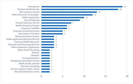 Figure 5 presents the distribution of the studied information technologies in the reviewed studies. As suggested by Rahimi et al. [6], the categorization of information technologies was performed based on the Medical Subject Headings (MeSH) thesaurus [73]. With more than 48% (N = 69), it is clear that prior research is mainly dominated by five main categories, including telemedicine solutions, HIT systems in general, cloud computing applications, mobile applications, and electronic health records (e.g., health information solutions and electronic medical records). By having a quick look at the analysis in Table 5, it seems that the classification of technologies across the countries is equally distributed, with a slight notable difference in telemedicine and cloud computing. Telemedicine was mainly studied in Taiwan and the USA, while cloud computing was primarily studied in Taiwan.