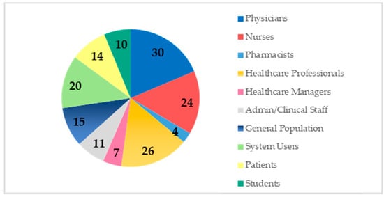 Figure 6 presents the distribution of studies according to the participants (user groups). With almost 56% of the total participants, physicians (N = 30), nurses (N = 24), and healthcare professionals in general (N = 26) attracted the attention of scholars to understand their technology acceptance. In terms of technology type and participants, we observed that the focus is scattered with little attention to study the acceptance of electronic health records by the same leading user groups (see Table 6). Additionally, there are efforts to understand the acceptance of patients and the general population as non-healthcare workers for various technologies, including telemedicine, mobile applications, cloud computing, and wearable electronic devices.