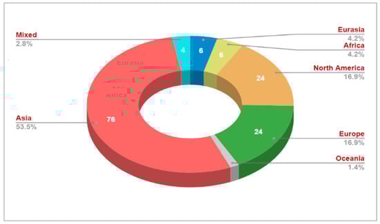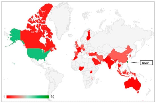 This review also determined the origin country and the region for each analyzed study. As per Figure 7, the majority of publications were conducted in Asia (N = 76), with 53.5% of the whole analyzed studies. Taiwan recorded 20.27% (N = 30) of the entire analyzed studies, as seen in Table 7. Further, the USA as a first runner-up is doing well, with 22 empirical studies (14.86%) to assess technology acceptance in healthcare. As shown in Figure 8, the geographic heat map indicates that there are no publications conducted in the Central and South American regions. The rest of the statistics related to country and region are illustrated in Table 7 and Figure 7 and Figure 8.