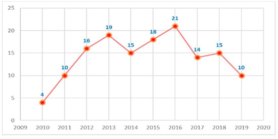 The analyzed studies in the inspected period were categorized according to the year of publication, as presented in Figure 9. The studies are reflected through more or less constant frequency in the last decade, with peaks in 2013, 2015, and 2016. There is a remarkable drop in the number of studies from 2017, which can maximize the gap in the technology acceptance literature, especially with the ongoing boom in information technologies.