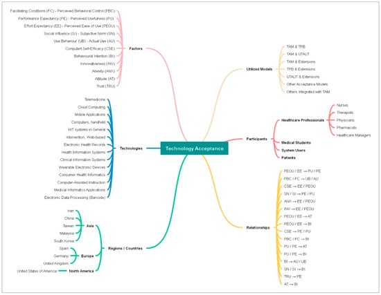 The results of this review are believed to add a thorough understanding of the literature on technology acceptance in healthcare. The fundamental goal of this study was to review the empirical studies and analyze the results to understand the research situation of technology acceptance in the healthcare sector. This review covered the studies conducted in the recent decade to explore the acceptance of different technologies using different acceptance theories, various factors, and different healthcare organizations or settings. Figure 10 represents the mind map for the results summary. Concerning the study characteristics, the analysis classified the studies according to the studied model to address the prevailing technology acceptance models in the healthcare domain. The TAM, its extensions, and modifications are leading the research of technology acceptance in healthcare. It was also found that several studies have discussed integrated models. In general, the main aim of the integration in those studies was to improve the explanatory power of the TAM model. These results align with what was proposed by [47] regarding the power of TAM in investigating the user’s acceptance of technology in general. Moreover, the UTAUT and its extensions were widely employed to explore the user’s acceptance of several healthcare technologies. This observation is compatible with the conclusions of prior research [28,29]. Additionally, the results showed that the number of studies, including the TPB model, is reasonable. These findings confirm the importance of studying various models as performed by [18,31], to better understand technology acceptance and facilitate building more unified models [74].