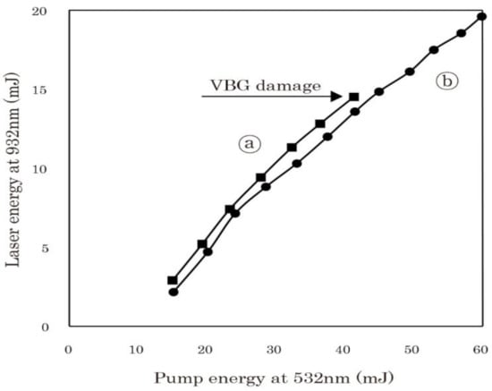 Energy characteristics of Ti:Sapphire laser with VBG (a) and STG (b). Reprinted with permission from ref. []. Copyright 2015 © The Optical Society.