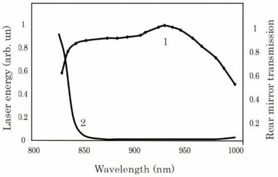 Wavelength dependence of Ti:Sapphire laser energy (1) and reflection coefficient of rear mirror (2). Reprinted with permission from ref. []. Copyright 2015 © The Optical Society.