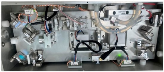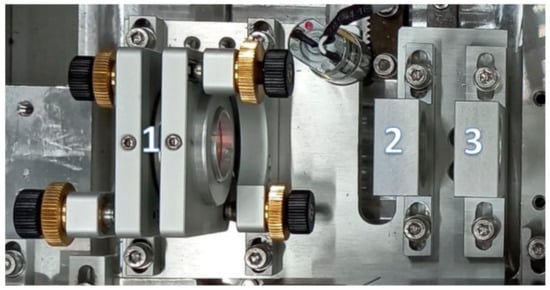 A part of HELIOS-4 laser head with assembled components for Ti:Sapphire laser: 1—mounts with Ti:Sapphire crystal and laser cavity mirrors, 2—holder with condenser lens and 3—holder with MLA.