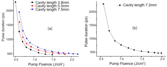 From Figure 6, one can see that when WPUMP exceeded ~1.4 J/cm2, T remained almost unchanged. On the one hand, this did not allow us to achieve T ≤ 460 ps. On the other hand, the low dependence of T on the WPUMP resulted in the high stability of T. At maximum values of WPUMP, we obtained the standard deviation of T as low as 1%. The reduction in the cavity length from 7.5 to 3.8 mm did not allow us to reduce the minimum available T, and resulted only in a reduction in WPUMP, which is required to achieve the minimum T. This can reduce the risk of laser crystal damage by setting a lower WPUMP without increasing T.