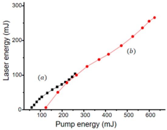 Dependence of E on EPUMP: (a)—pump spot 3.4 × 3.4 mm, L = 7.5 mm; (b)—pump spot 5.6 × 5.6 mm, L = 7.2 mm. Reprinted with permission from ref. []. Copyright 2019 © The Optical Society.