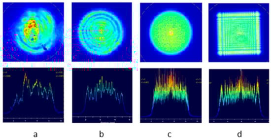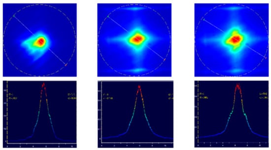 The angular distribution of Ti:Sapphire laser radiation was investigated for three different pump patterns, which are shown in Figure 9b–d. The parameters of Ti:Sapphire laser were the same for all three pump patterns: we set up a laser resonator with flat pump and output mirrors; the reflection coefficient of the output mirror was 70%, the Ti:Sapphire crystal thickness was 3 mm, the distance between mirrors was 6.5 ± 0.3 mm, and the pump spot size was ~5 mm.