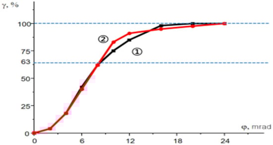 The angular distribution of Ti:Sapphire laser energy for single-mode pumping: 1—WPUMP = 1.0 J/cm2; 2—WPUMP = 1.5 J/cm2. Reprinted with permission from ref. []. Copyright 2019 © The Optical Society.