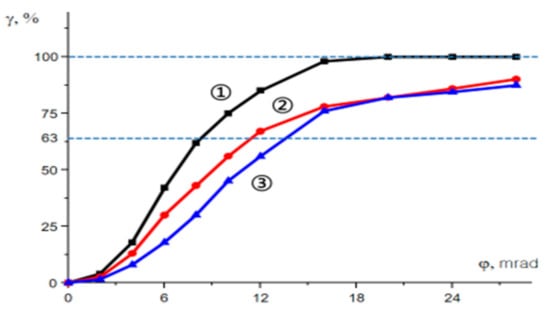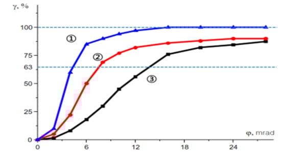 The results of the experimental investigation are shown in Figure 10, Figure 11, Figure 12, Figure 13, Figure 14 and Figure 15. Figure 10 shows the angular distribution of the Ti:Sapphire laser energy under single mode pumping at two different W. Here, γ is a part of total laser energy, irradiated within angle φ. Angular divergence, measured at the (1/e) level (63% of total laser energy are concentrated within this angle), was 8 mrad at W = 1 J/cm2 and did not increase with the increase in pump fluence (at least, up to 1.5 J/cm2). The wings of the angular distribution were small; more than 90% of laser energy was concentrated within 12–15 mrad.