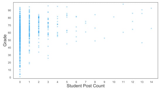 Crude Post Count against Student Grade. There was a positive relationship between Post Count and Grade that was not suitable for a linear OLS fit.