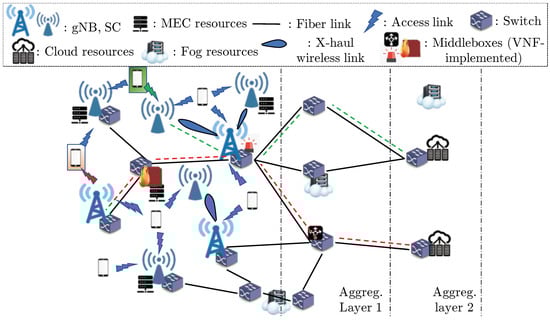 Mobile network of heterogeneous communication and computation nodes along with middlebox functionality offered by deployed VNFs. Dashed color lines indicate 2 illustrative E2E paths selected for 2 highlighted UEs.