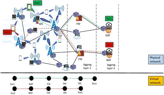 Embedding of virtual network (bottom part) into the physical network (top part). For illustration, 2 distinct SFCs are shown (in green and red) corresponding to 2 different UE requests, and each SFC is described by its own virtual network.  (green color) contains 6 virtual nodes and 5 virtual edges, whereas  contains 5 virtual nodes and 4 virtual edges. The virtual nodes will be mapped to actual physical nodes, while the virtual edges will be mapped to actual paths in the physical network.