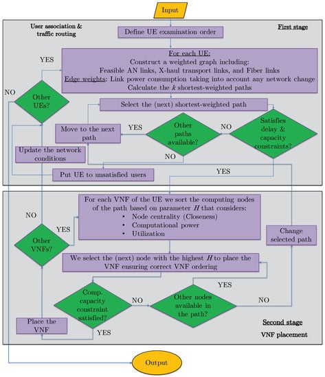 Our proposed Heuristic for Energy-efficient VNF placement, traffic Routing, and user assOciation (HERO) aims to maximize the network energy efficiency while ensuring low UE blocking probability. HERO consists of two stages, as shown in Figure 3. In the first stage, the traffic path is selected (i.e., user association and routing is performed), while in the second stage VNF placement takes place, ensuring correct VNF ordering.