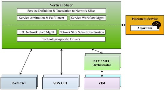 - Casetti, C.; Chiasserini, C.; Martín-Pérez, J.; Molner, N.; Deiss, T. The Vertical Slicer: Verticals’ Entry Point to 5G Networks. In Proceedings of the 27th European Conference on Networks and Communications (EuCNC 2018), Ljubljana, Slovenia, 18–21 June 2018. [Google Scholar]