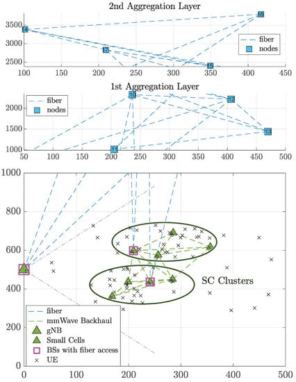 In our work, the heuristics were developed in MATLAB, while IBM CPLEX [] was used to compute the optimal solution of the MILP described in Section 2.1. The simulation scenarios considered a gNB sector area of 500 m radius overlaid with two SC clusters [], as shown in Figure 5. Each cluster contained four possible SCs, which were randomly and uniformly placed in an 100-m-radius from the cluster centers. The minimum allowable distances are given in []. A subset of BSs, namely one SC (randomly selected) per cluster and the gNB, was assumed to have fiber access to the aggregation network. mmWave X-haul links could be deployed among BSs as long as their distance was lower than 200 m. The aggregation network consisted of two layers each one comprising four possible node positions, as shown in Figure 5. The aggregation layer nodes were connected among them and with the BSs via fiber so that there was no disconnected node. Hotspot UE traffic was also assumed [].
